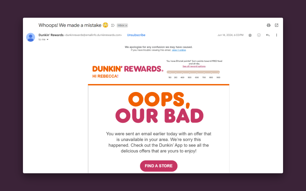 Dunkin’ lähetti vahingossa sähköpostin, jossa oli tarjous, joka ei koskenut tiettyä aluetta.