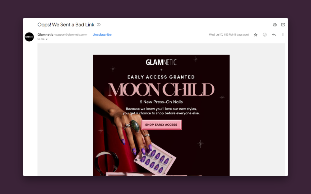 Erilaiset virheet vaativat erilaisia ratkaisuja. Glamnetic ymmärsi, että rikkinäinen linkki oli helppo korjata: korvaamalla se toimivalla. He muuttivat vain otsikon, korjasivat linkin ja lähettivät viestin uudelleen.