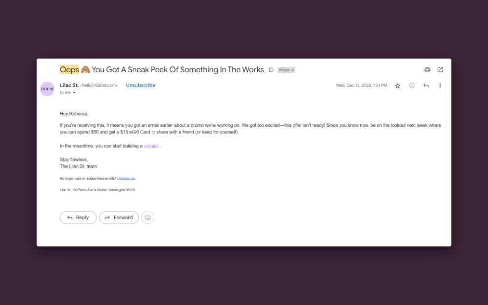 Lilac St. tunnisti virheen ja kertoi asiakkaille, että tarjous on tulossa pian. Vaikka he eivät julkaisseet kampanjaa samana päivänä, he saivat todennäköisesti runsaasti huomiota lähettämällään sähköpostilla.