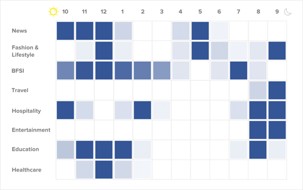 Näiden ilmoitusten lähetysajankohta on tärkeä. Vaikka kannattaakin tutkia tarkemmin omaa toimialaa, markkinoita ja tilaajia (sekä huomioida eri asiakassegmentit), voi seuraavaa taulukkoa käyttää suuntaa-antavana ohjeena. Mitä parempi ajankohta, sitä tummempi ruutu: